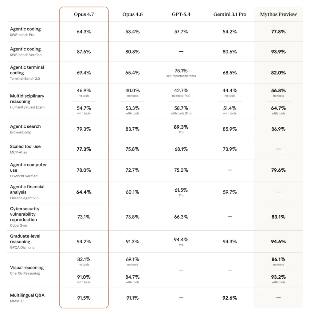 The model also has substantially better vision: it can see images in greater resolution. It’s more tasteful and creative when completing professional tasks, producing higher-quality interfaces, slides, and docs. And—although it is less broadly capable than our most powerful model, Claude Mythos Preview—it shows better results than Opus 4.6 across a range of benchmarks: