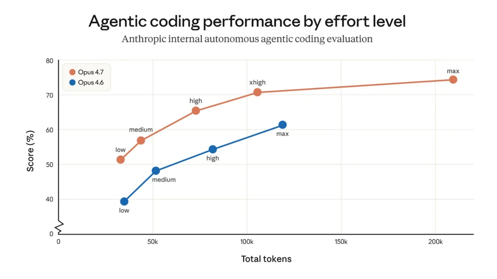 Users can control token usage in various ways: by using the effort parameter, adjusting their task budgets, or prompting the model to be more concise. In our own testing, the net effect is favorable—token usage across all effort levels is improved on an internal coding evaluation, as shown below—but we recommend measuring the difference on real traffic. We’ve written a migration guide that provides further advice on upgrading from Opus 4.6 to Opus 4.7.