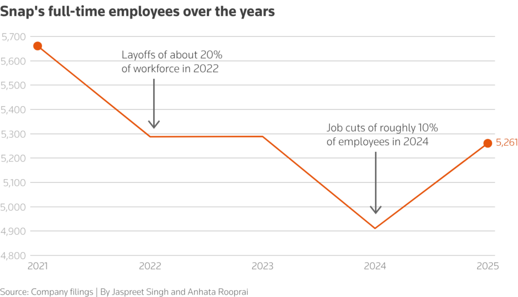 Snap will lay off about 1,000 employees, including 16% of full-time staff, the company said on Wednesday, becoming the latest tech firm to shift toward leaner teams as it ramps up AI adoption to streamline operations.