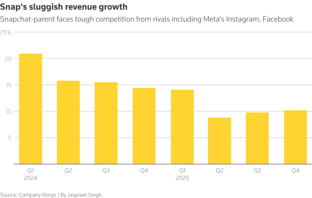 AI is reshaping the workforce by automating routine tasks, with 80 tech companies cutting about 71,440 jobs so far this year, according to data aggregator Layoffs.fyi. Snap expects first-quarter revenue to rise about 12% to roughly $1.53 billion, largely in line with Wall Street expectations, according to data compiled by LSEG.