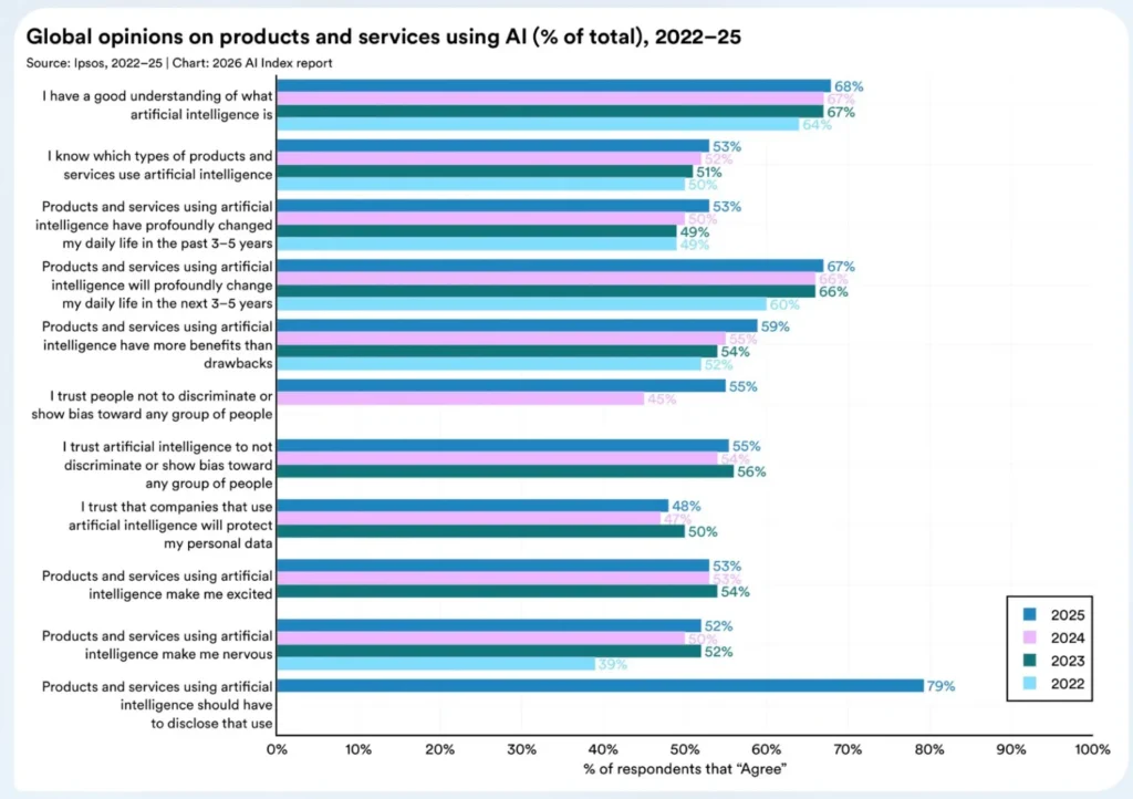 Despite these concerns, global sentiment toward AI is not entirely negative. Data shows a slight increase in the number of people who believe AI’s benefits outweigh its risks. However, at the same time, feelings of nervousness about AI are also rising. This dual trend—growing adoption alongside growing unease—captures the current state of AI: a powerful technology advancing rapidly, but without widespread confidence from the people it is set to impact the most.